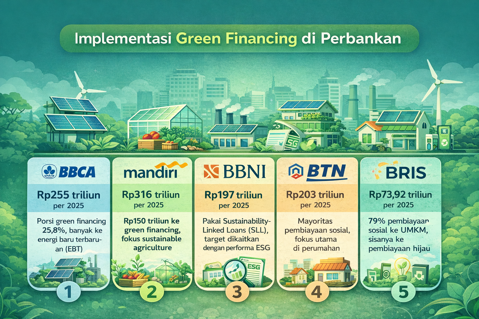 Secara umum, implementasi green financing di perbankan Indonesia masih berada dalam fase berkembang, tetapi arahnya sudah semakin jelas. Setiap bank mulai membentuk strategi yang sesuai dengan karakter bisnisnya, sekaligus menyesuaikan diri dengan tuntutan regulasi dan pasar. Bagi investor, perbedaan pendekatan ini menjadi sinyal penting untuk memahami bagaimana masing-masing bank membaca peluang dan risiko di masa depan.